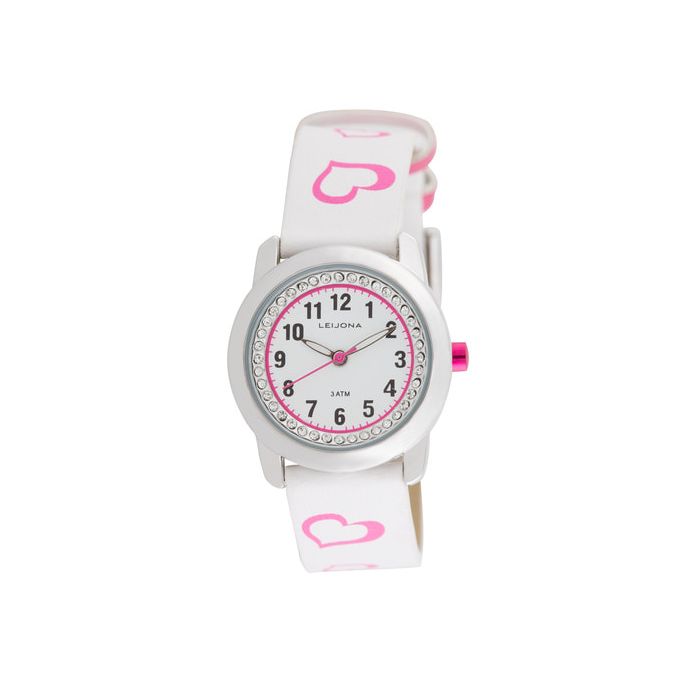 Leijona lasten rannekello korukivillä 5323-807 selkeällä kellotaululla ja valkoisella rannekkeella. Laadukas quartz-koneisto ja kestävä mineraalilasi. Kellossa on kauniit strassikoristelut ja ranneketta koristavat söpöt sydänkuviot! Rungon halkaisija on 26mm ja rannekkeen leveys kiinnityskohdasta on 14mm. Vesitiiveys 30m.
